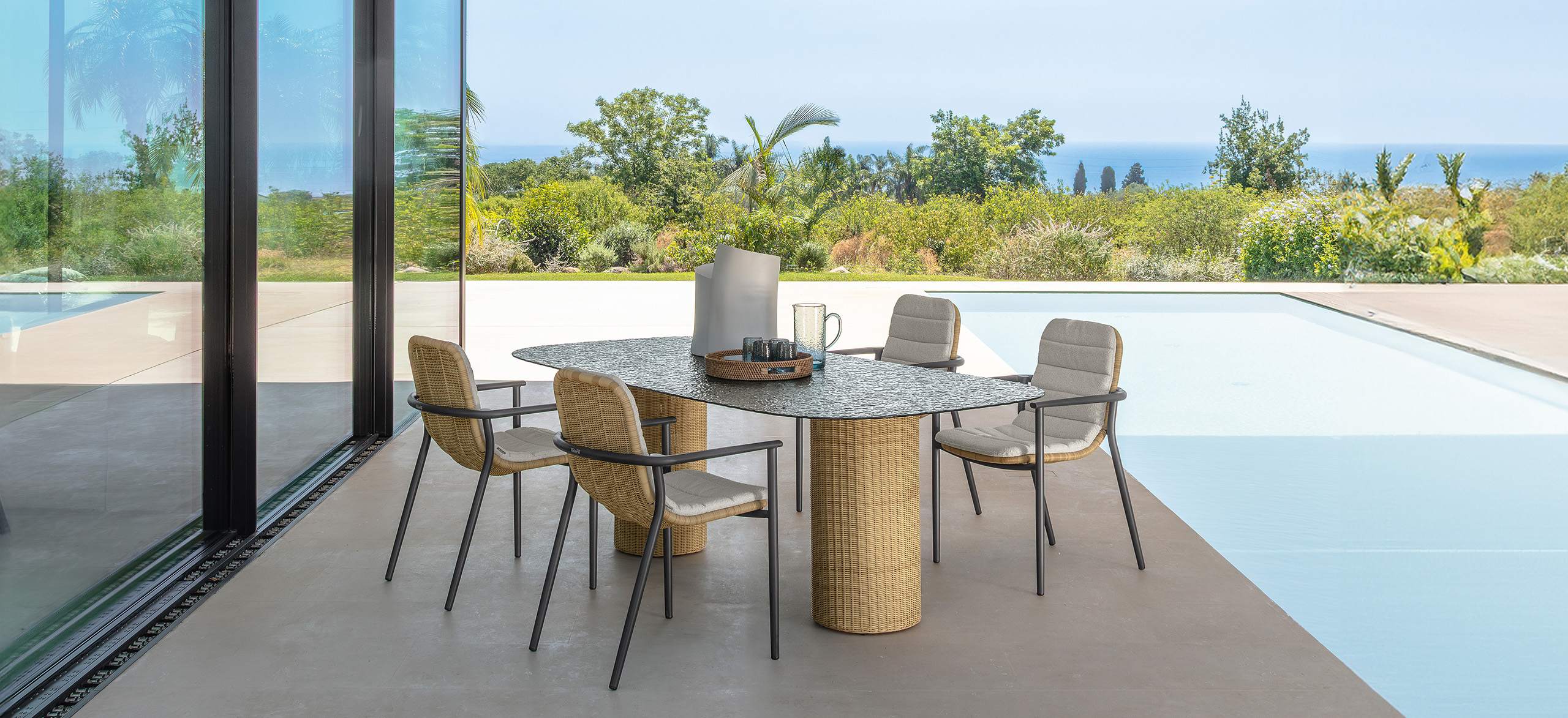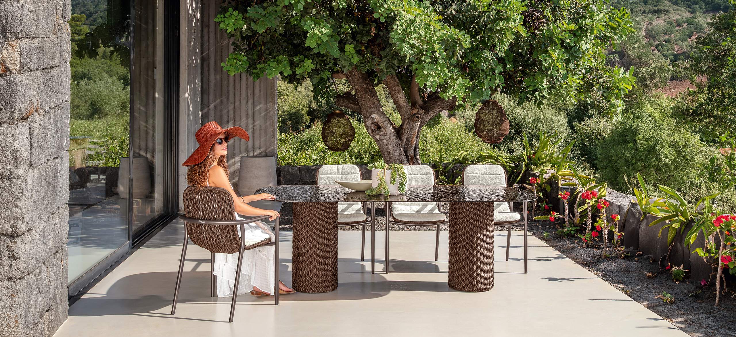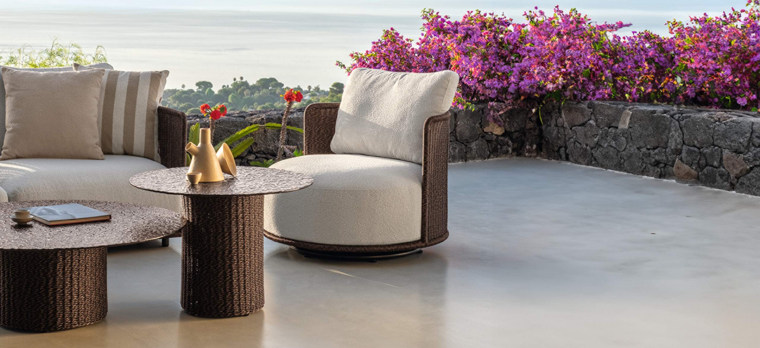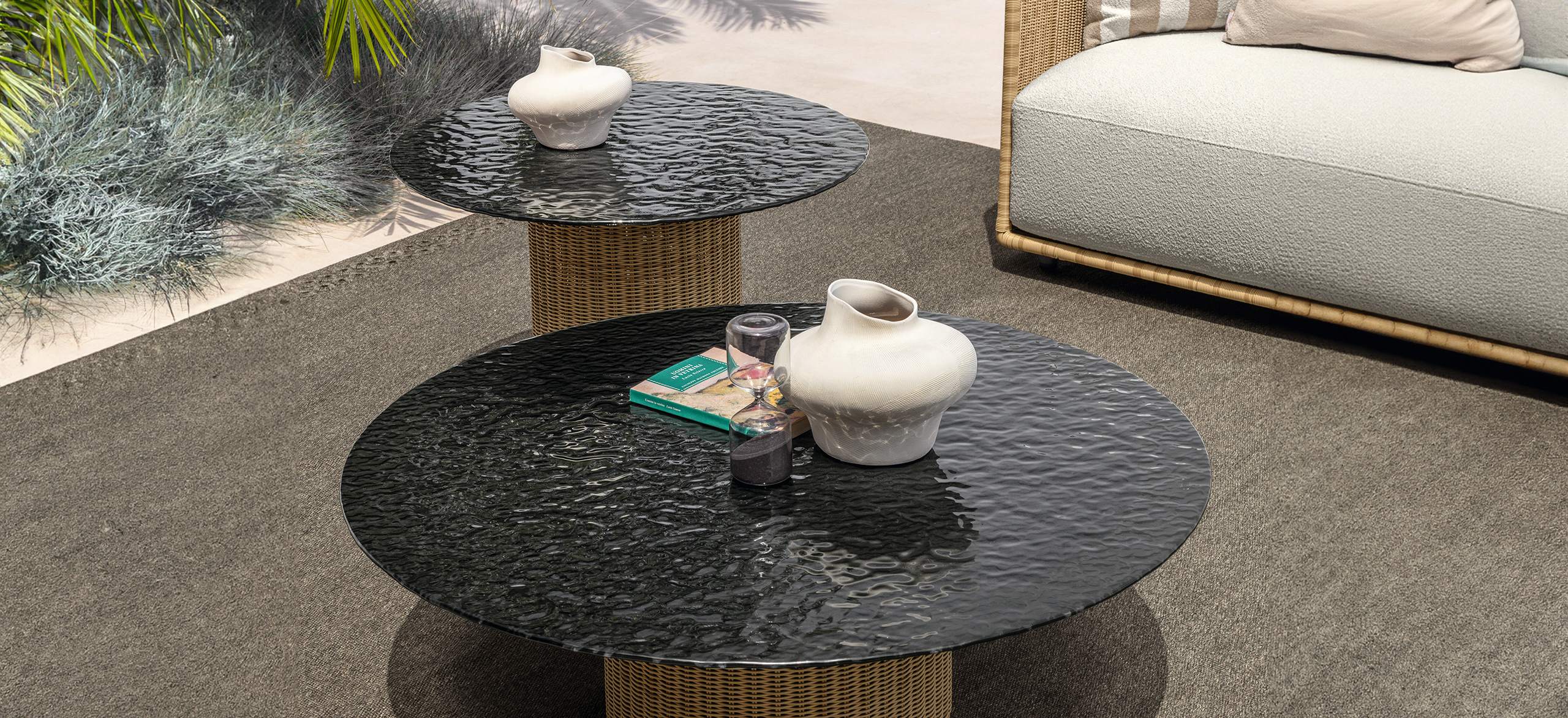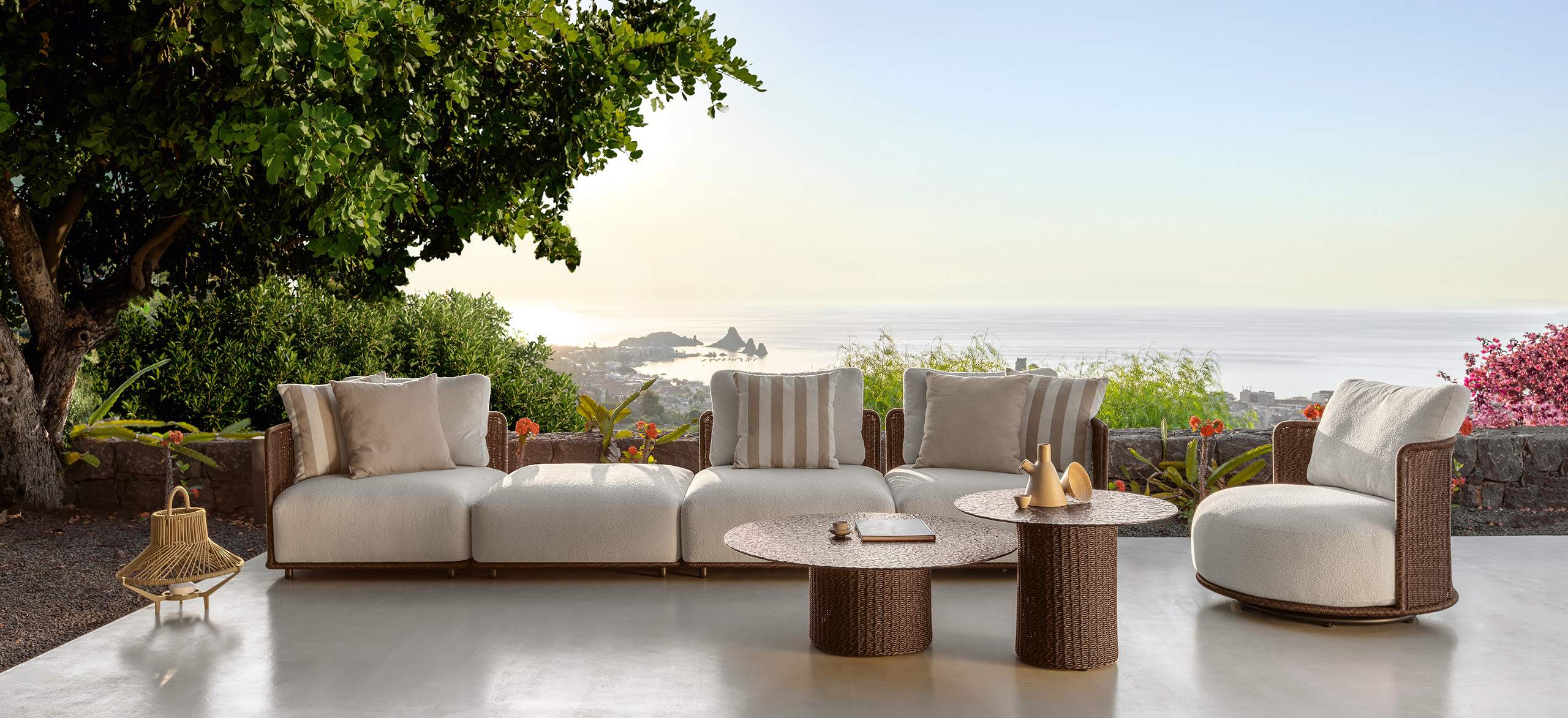 Bond is inspired by the concept of union, of closeness, which is expressed precisely through the combination of individual modules. The rounded shape of the seat cushions emphasizes this bond and plays on the shadows created by the volumes. The seats, extremely generous, but compact in depth, are of great impact and make the sofa a piece of furniture with manifest comfort. The tubular aluminum structure is covered in wicker and completes the architectural part of the object. Comfort is also guaranteed by generous deco cushions. The family is completed with revolving living seats, lounges and dining rooms that reflect the intertwining of the sofa, in light or more intense colour, delicately supported by an aluminum structure whose shape varies dynamically creating a pleasant movement and sense of lightness. The tops of the coffee and lunch tables bring innovation among the materials of the Talenti range: : resting on one or more cylindrical structures, they are composed of a textured glass top, with nuances ranging from coffee to smoky grey, and which refer to the profiles of the earth.