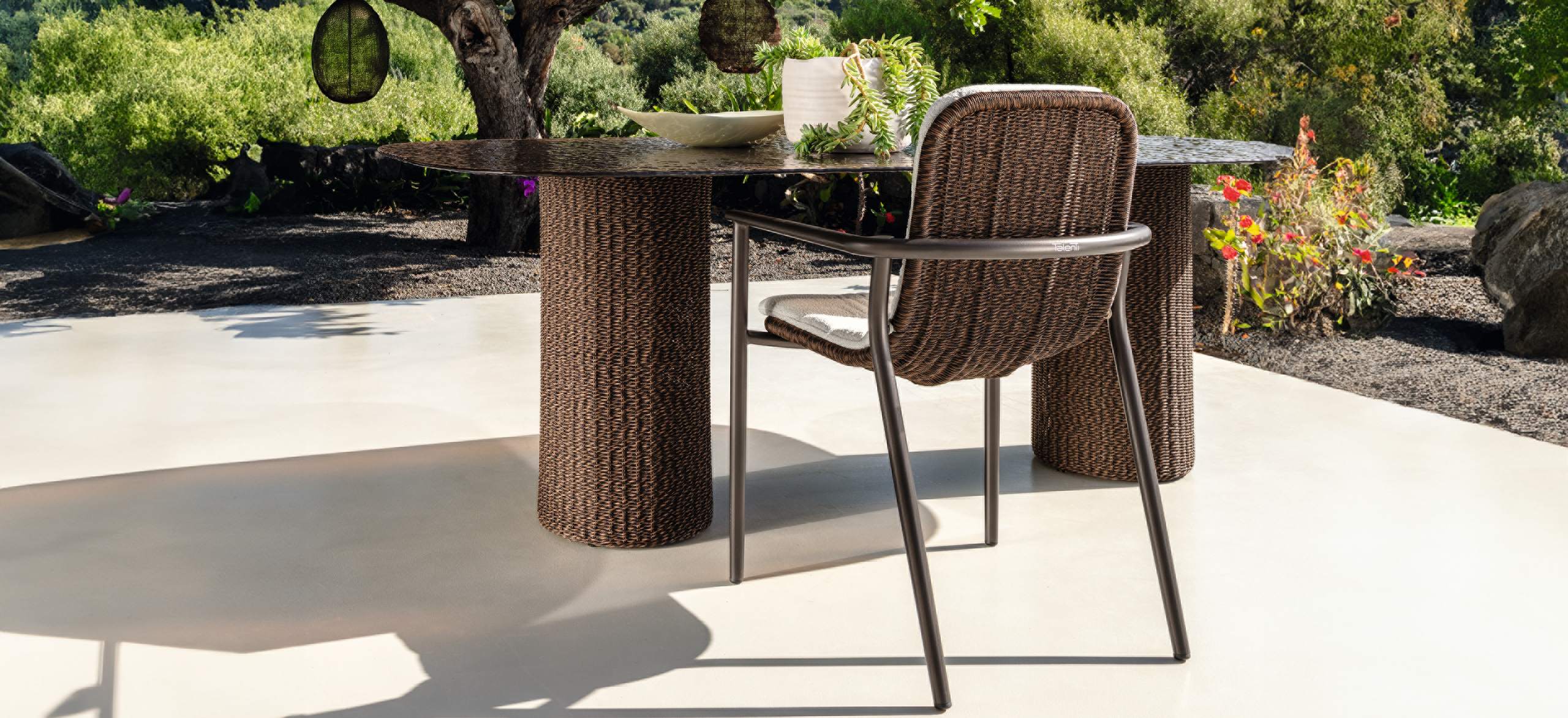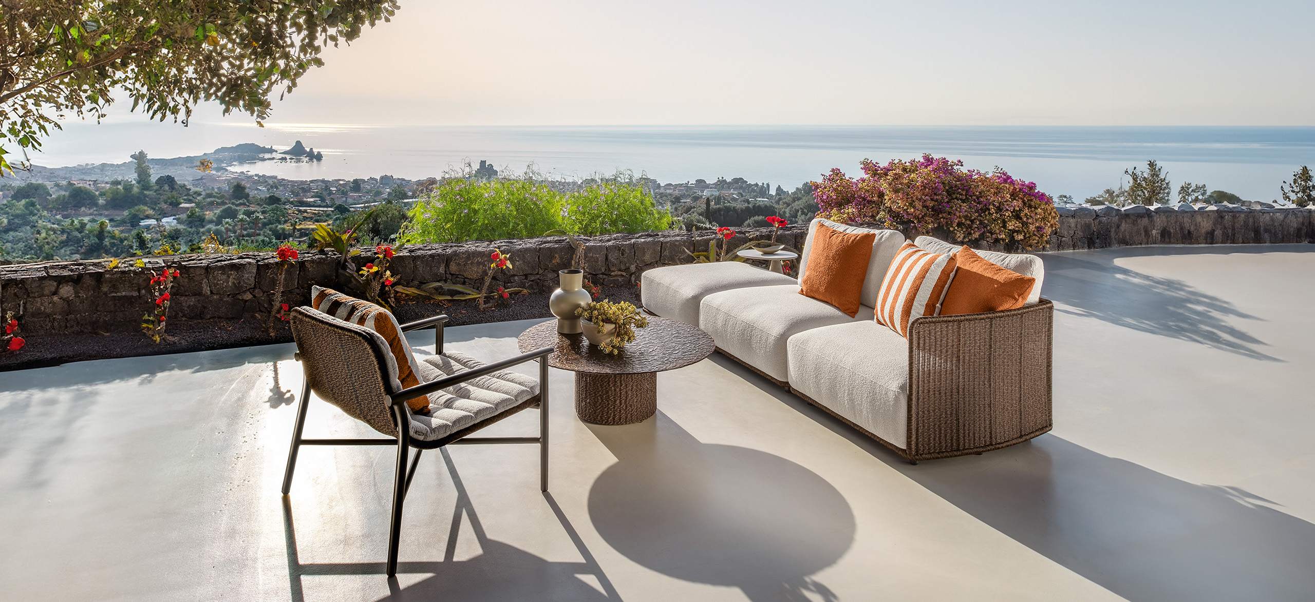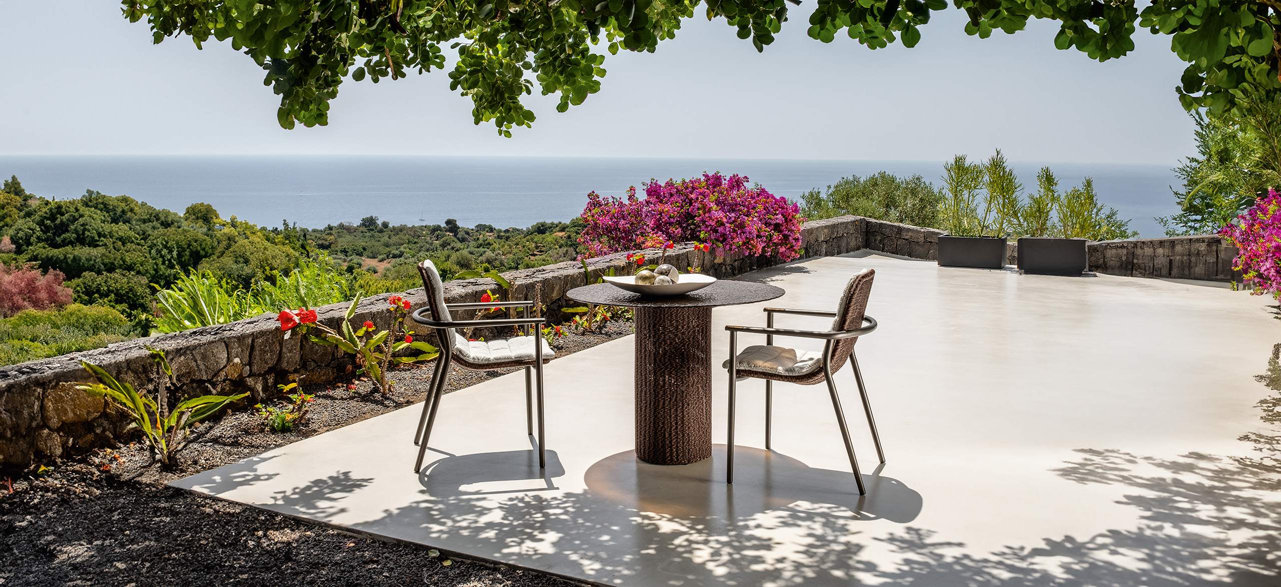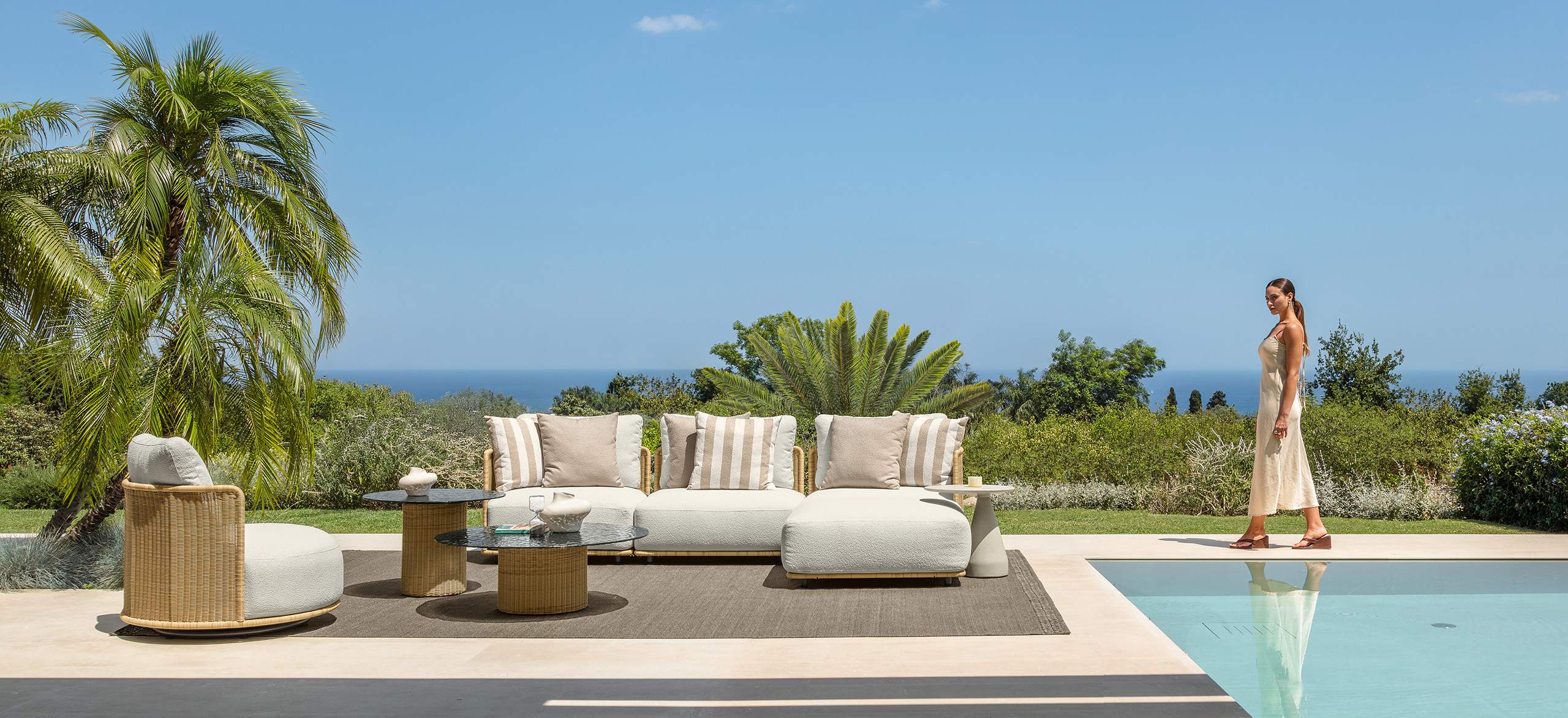 Bond is inspired by the concept of union, of closeness, which is expressed precisely through the combination of individual modules. The rounded shape of the seat cushions emphasizes this bond and plays on the shadows created by the volumes. The seats, extremely generous, but compact in depth, are of great impact and make the sofa a piece of furniture with manifest comfort. The tubular aluminum structure is covered in wicker and completes the architectural part of the object. Comfort is also guaranteed by generous deco cushions. The family is completed with revolving living seats, lounges and dining rooms that reflect the intertwining of the sofa, in light or more intense colour, delicately supported by an aluminum structure whose shape varies dynamically creating a pleasant movement and sense of lightness. The tops of the coffee and lunch tables bring innovation among the materials of the Talenti range: : resting on one or more cylindrical structures, they are composed of a textured glass top, with nuances ranging from coffee to smoky grey, and which refer to the profiles of the earth.