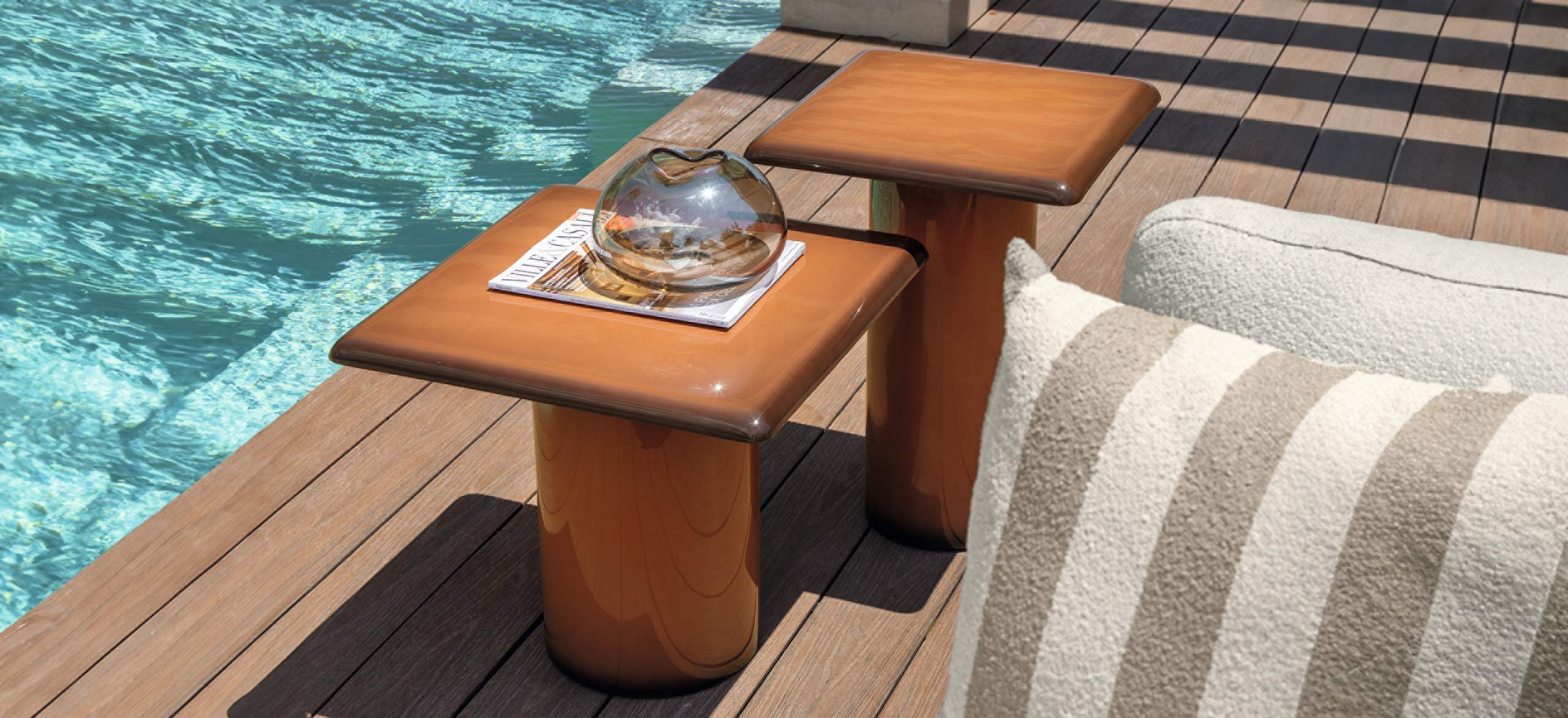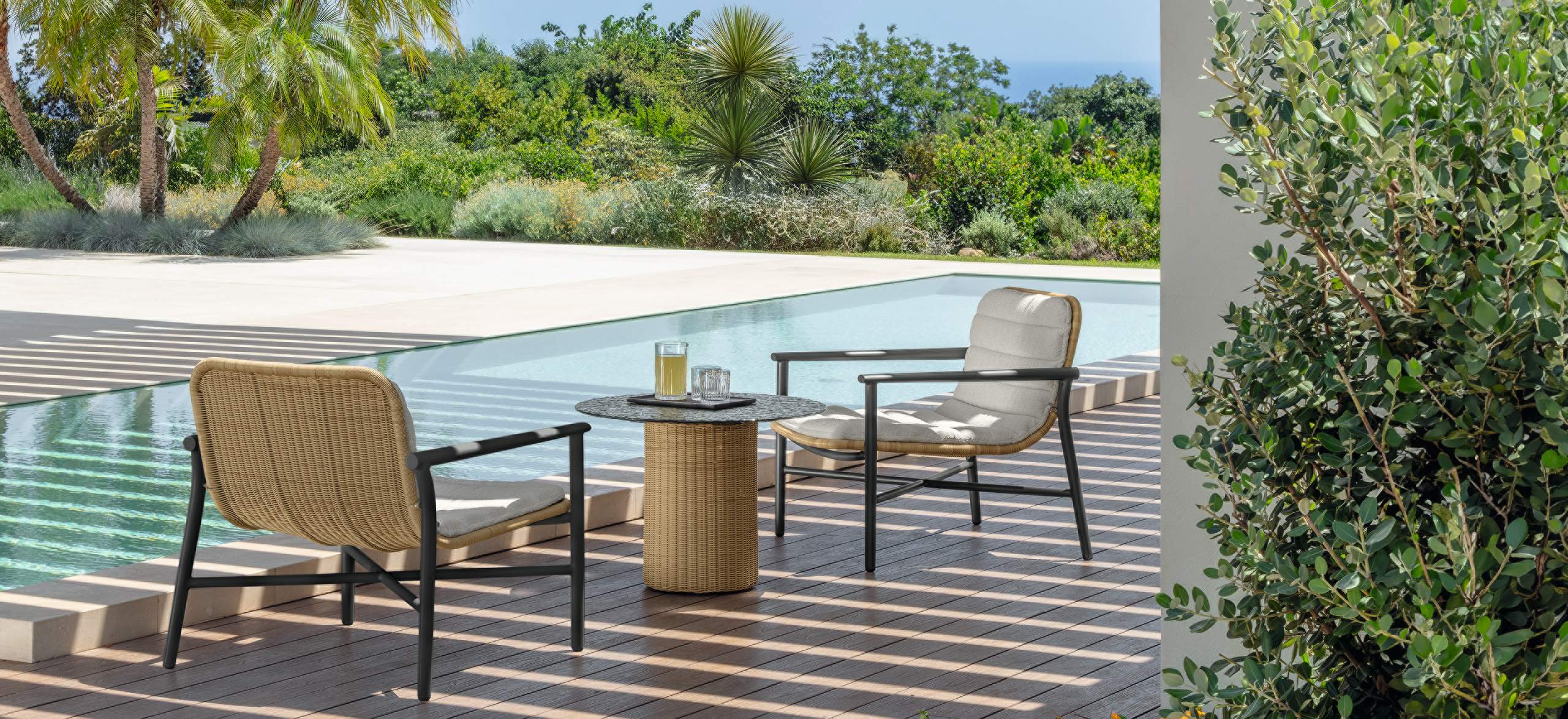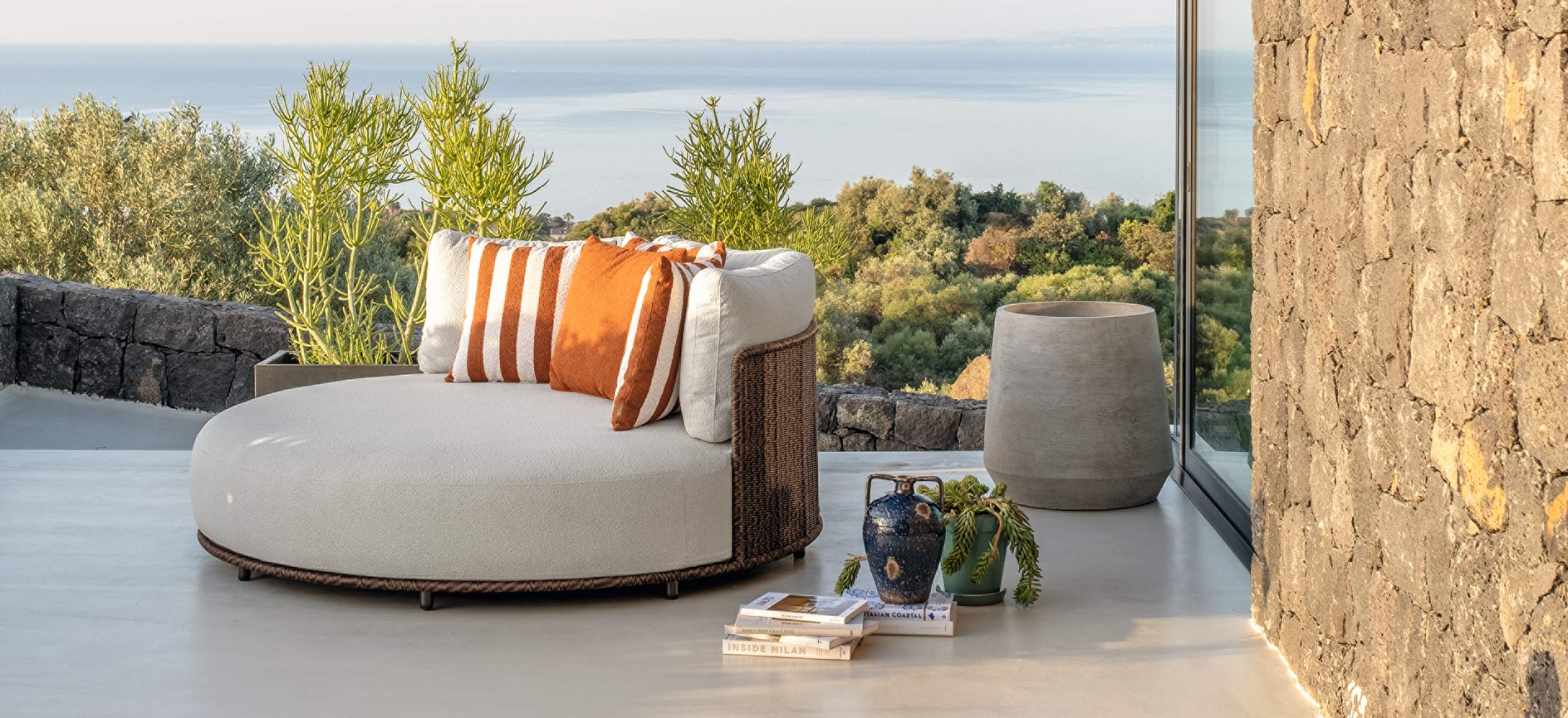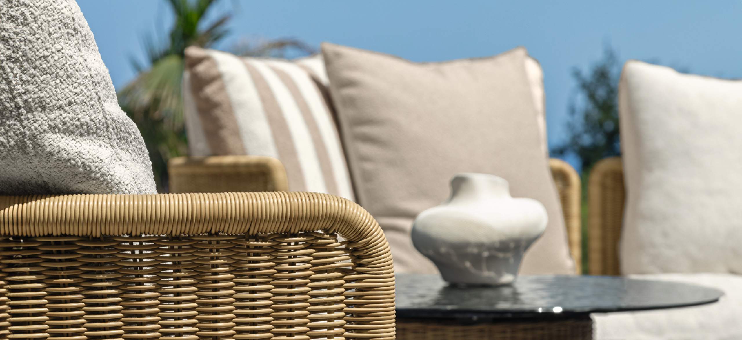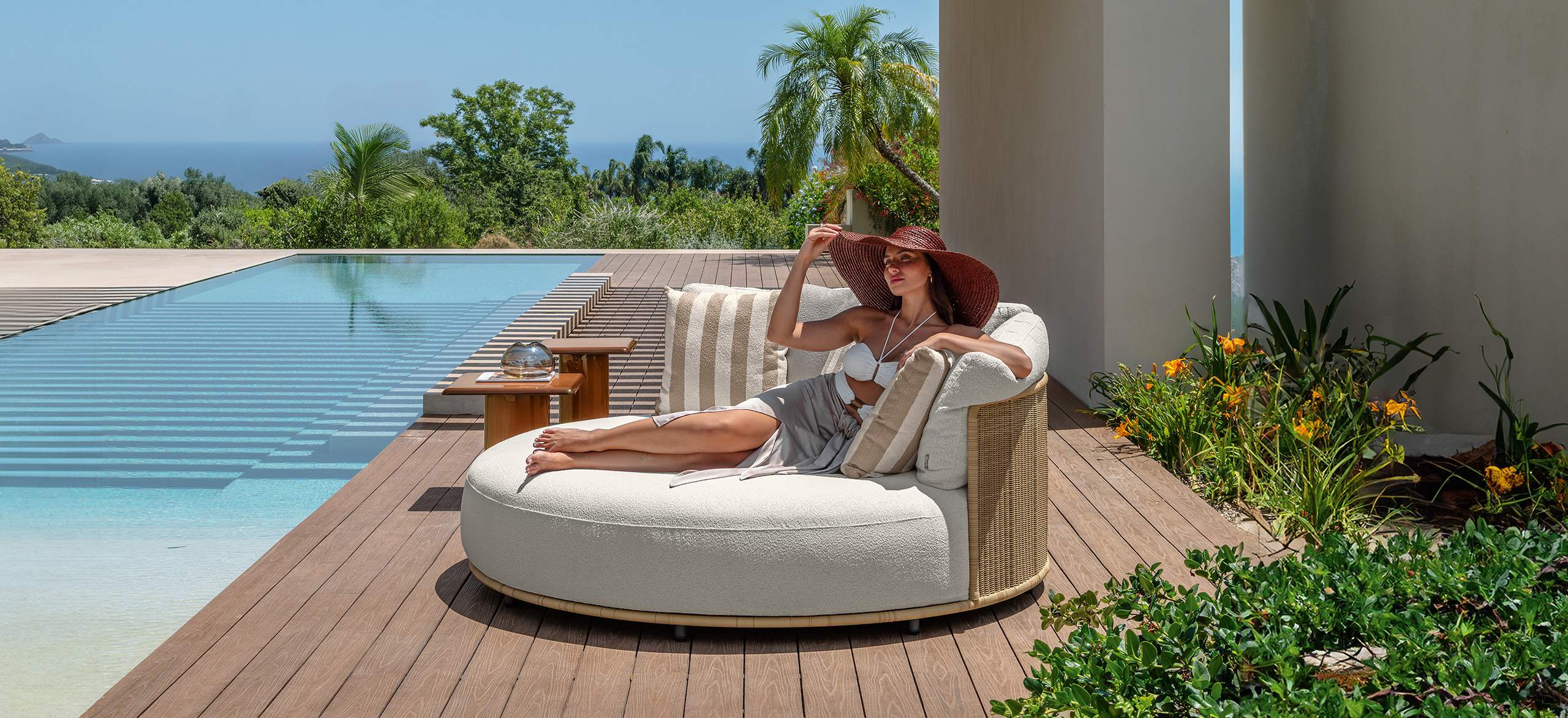 Bond is inspired by the concept of union, of closeness, which is expressed precisely through the combination of individual modules. The rounded shape of the seat cushions emphasizes this bond and plays on the shadows created by the volumes. The seats, extremely generous, but compact in depth, are of great impact and make the sofa a piece of furniture with manifest comfort. The tubular aluminum structure is covered in wicker and completes the architectural part of the object. Comfort is also guaranteed by generous deco cushions. The family is completed with revolving living seats, lounges and dining rooms that reflect the intertwining of the sofa, in light or more intense colour, delicately supported by an aluminum structure whose shape varies dynamically creating a pleasant movement and sense of lightness. The tops of the coffee and lunch tables bring innovation among the materials of the Talenti range: : resting on one or more cylindrical structures, they are composed of a textured glass top, with nuances ranging from coffee to smoky grey, and which refer to the profiles of the earth.