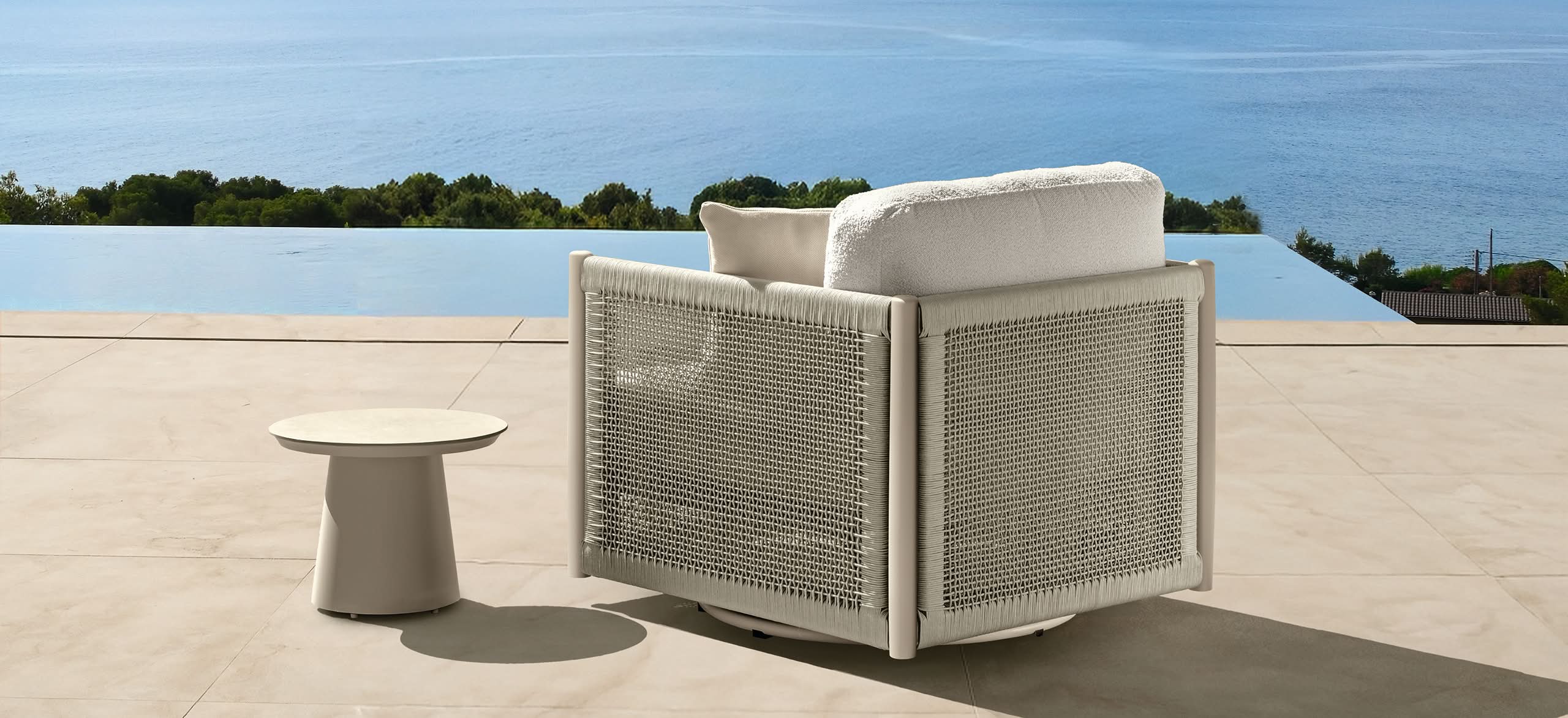 Dolcevita evolves by remaining true to itself, combining the simplicity of the teak lines with the versatility of aluminium. A collection with a strong character, but with a refined style, whose living, dining and relaxation elements in the double color warm white and graphite, are characterized by the finely hand-woven rope, ceramic tops and cushions in neutral colors, giving rise to a collection able to interpret outdoor living even in the smallest spaces, with a touch of modernity and personality