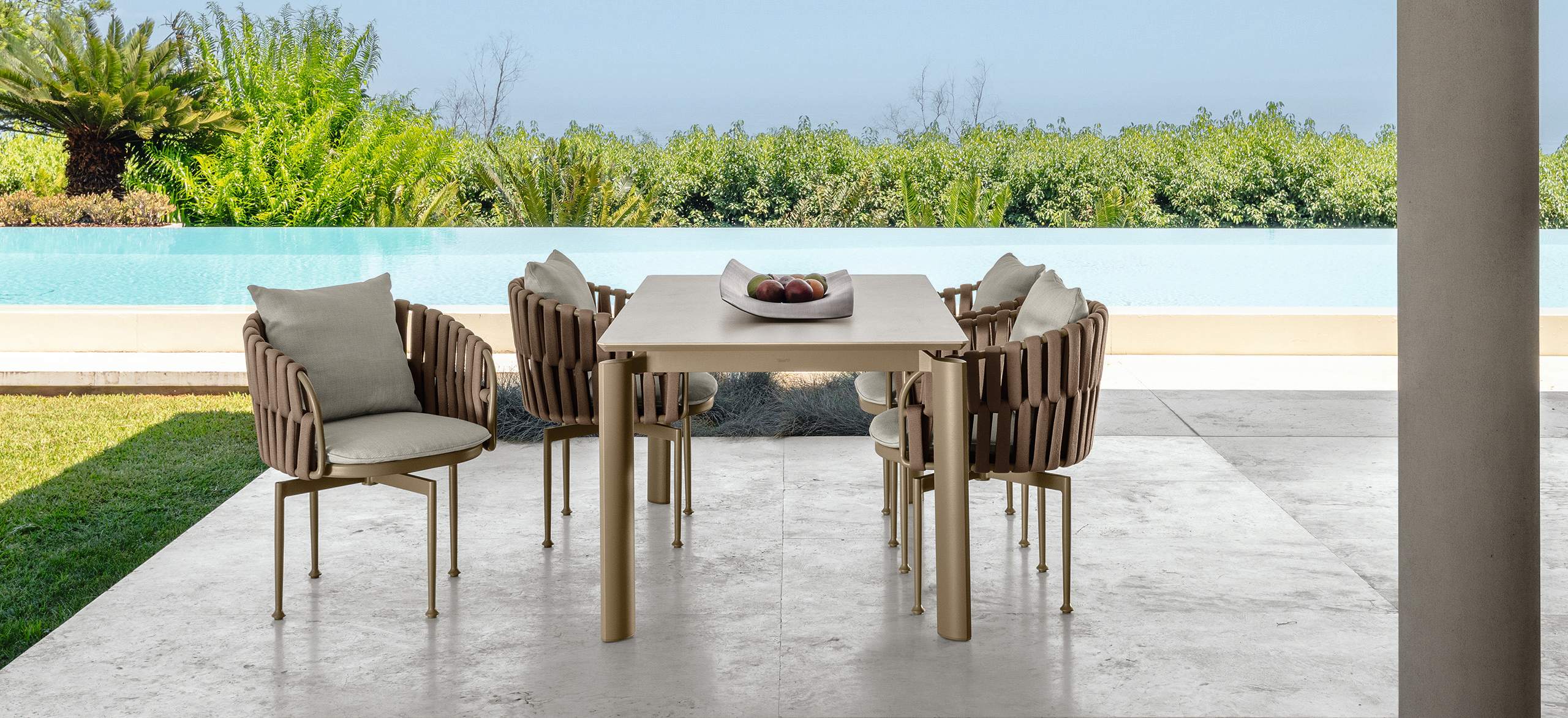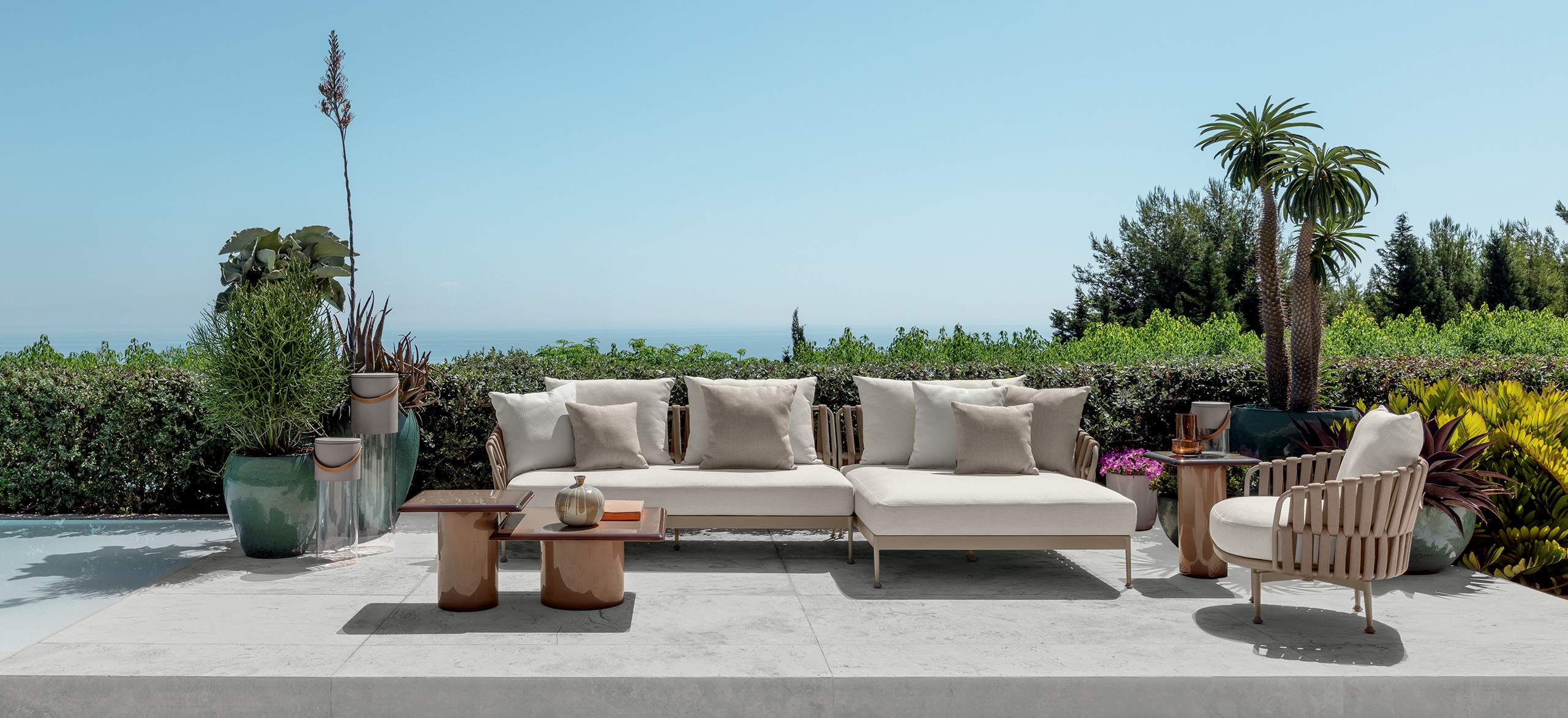 Frame Collection is characterized by the juxtaposition of aluminum structures, rope interweaving and comfortable cushions that make indisputable its sensual presence in the outdoor space. The interweaving of the padded rope on the tubular frame creates a reticulated window capable of giving fascinating plays of light when the rays lay on the slits. The light and sensual volumes are ideal for a perfect outdoor relax and a perfect visual privacy.