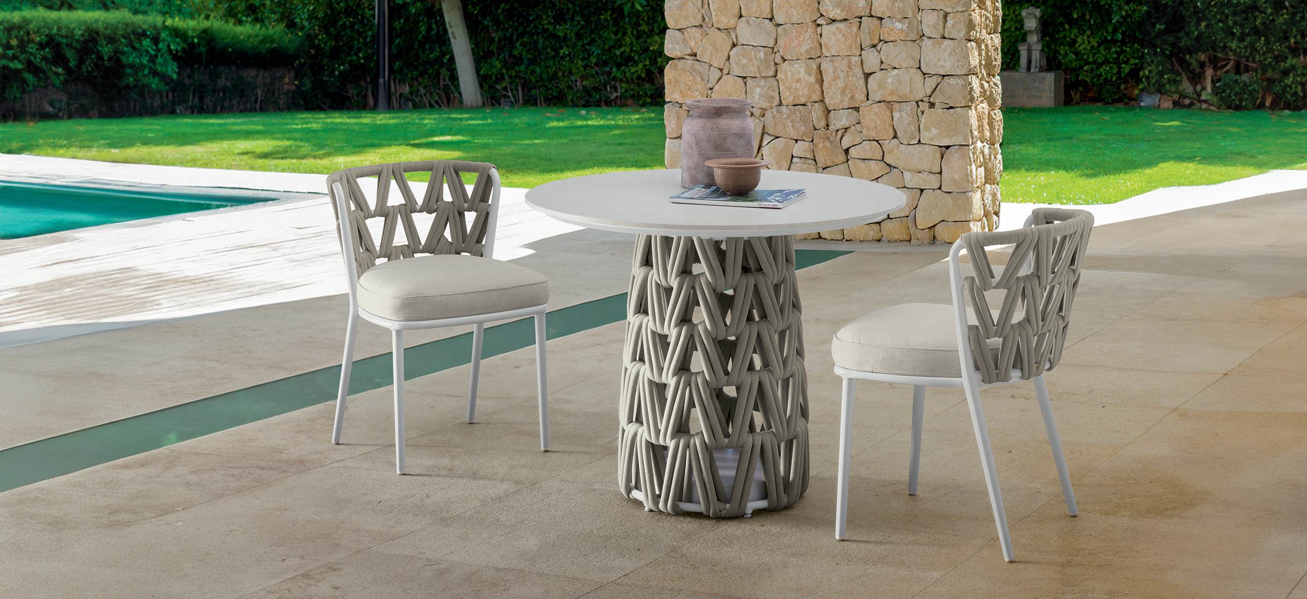 Designed by the Palomba studio Serafini, Swipe was born with the desire to create a collection that, as the name suggests, was dominated by movement. A project that combines extreme comfort with a design with a strong personality, characterized by the contrast between the soft lines of the seats and the geometries created by the versatile padded strings. The use of aluminum for the structure does not prevent the elements of this collection to develop in total absence of rigidity: the backs of sofas and armchairs contain generous cushions, opening at the ends, as if to welcome you in an embrace, while the dining elements of the collection seem to float in the air thanks to the interplay of transparencies of the woven base.