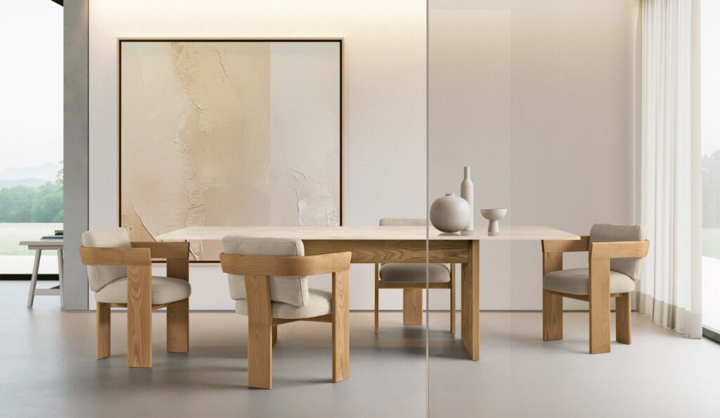 The FREDDIE armchair, designed for dining and living spaces, naturally challenges formal conventions, much like the iconic frontman of the legendary English band it is named after. Its design plays with proportions and contrasts, moving effortlessly between different styles while expressing the multiple identities of Talenti Home. Bold yet welcoming lines define a comfortable and versatile seat, able to adapt to various settings without losing character. Available with fabric or leather upholstery, FREDDIE is an armchair with a strong personality, created for those who enjoy elegant boldness.