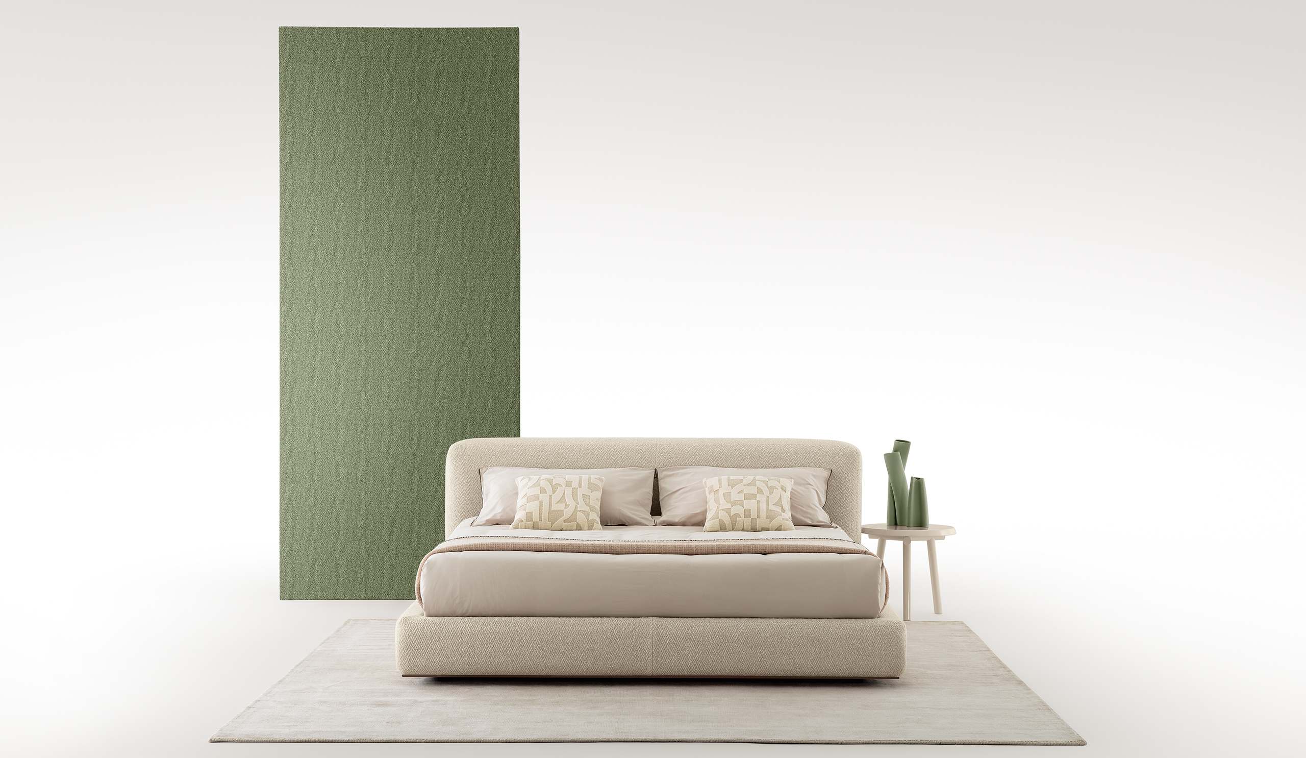 The GLADYS bed interprets the sleeping area with a soft, reassuring elegance, where comfort and construction quality come together in a balanced, timeless design. The generously padded headboard, wide and enveloping, rests on a structure made of multilayer plywood and solid wood, ensuring strength and long-lasting durability. The perimeter frame, also in multilayer plywood, is enhanced with padding in high-density expanded polyurethane and polyester fiber, offering a deep sense of comfort. The upholstery, available in fabric or leather, enriches the surfaces with refined materiality. The galvanized steel bed base support and die-cast aluminum feet with thermoplastic polymer floor tips complete a solid, comfortable bed designed for authentic rest.