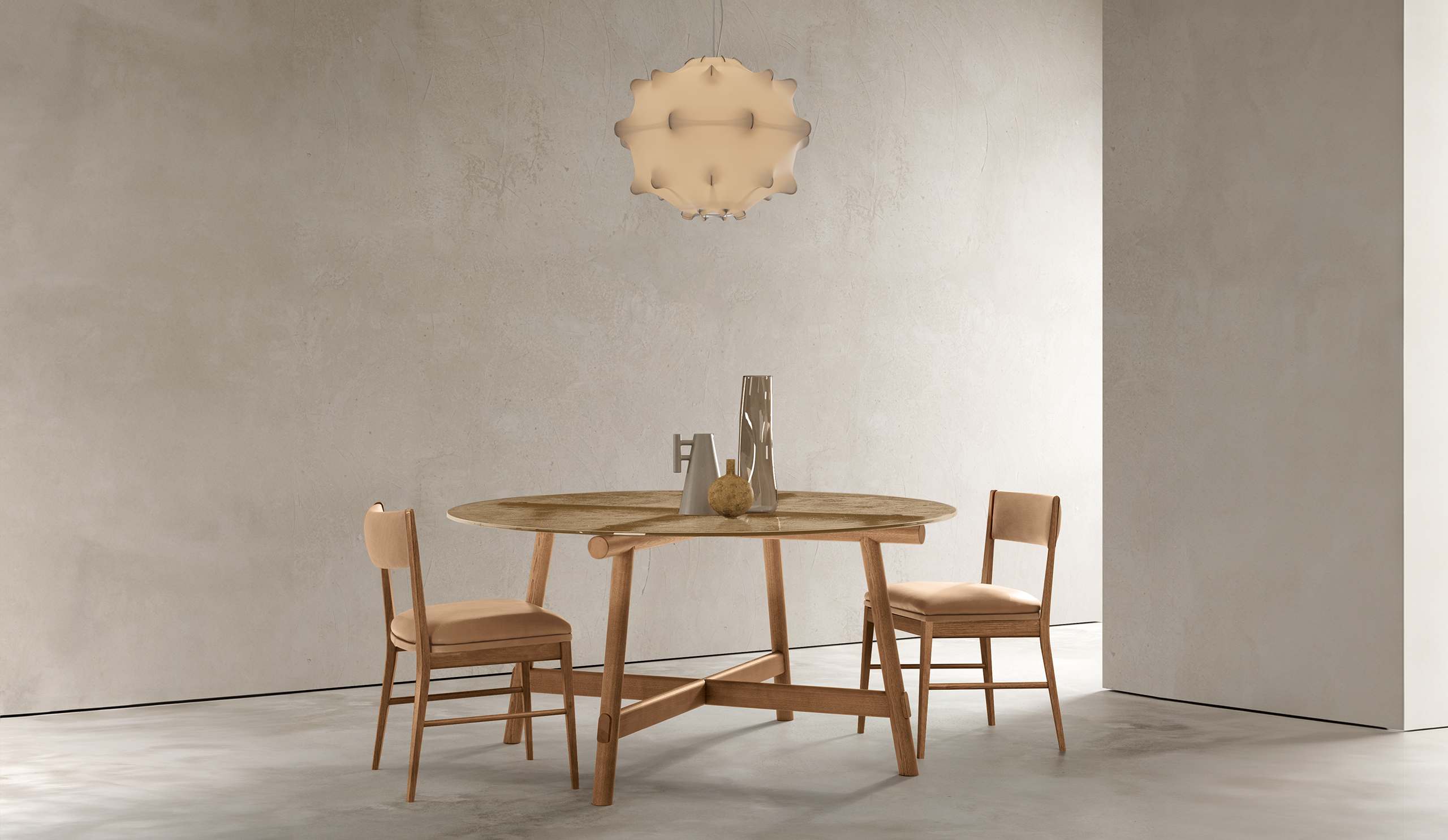 The HYDRA dining table embodies a refined balance between structural solidity and formal elegance. The generous tabletop is available in marble, lacquered or veneered finishes, offering different material expressions—from the richness of stone to the purity of lacquered surfaces and the warmth of natural wood. The architectural base, defined by inclined legs and carefully crafted joints, ensures stability and visual lightness. Designed for contemporary dining spaces, HYDRA becomes the focal point of the room, combining aesthetics, functionality and craftsmanship in a timeless project.