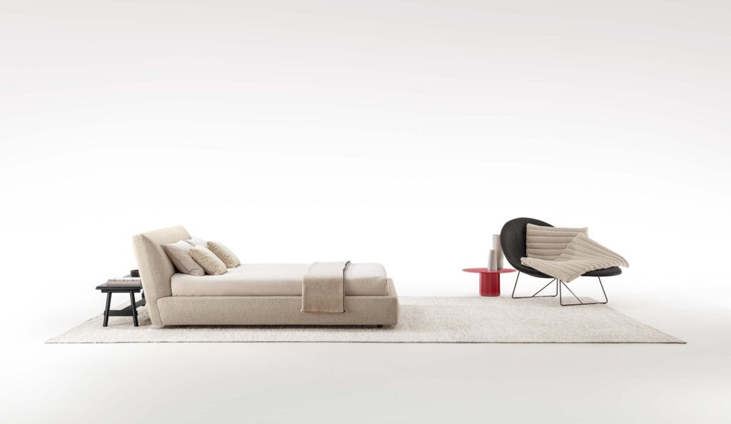 The TAMASHI bed interprets the sleeping area through a rigorous and harmonious design language, inspired by the essential values of Japanese tradition. The gently inclined upholstered headboard rests on a structure made of multilayer plywood and solid wood, ensuring strength and lasting comfort. The perimeter frame, also in multilayer plywood, is padded with high-density expanded polyurethane and polyester fiber, providing a soft and enveloping feel. Upholstery is available in fabric or leather, enhancing the purity of the design. A galvanized steel bed base support and die-cast aluminum feet with thermoplastic polymer floor tips complete a balanced project designed for deep, mindful rest.