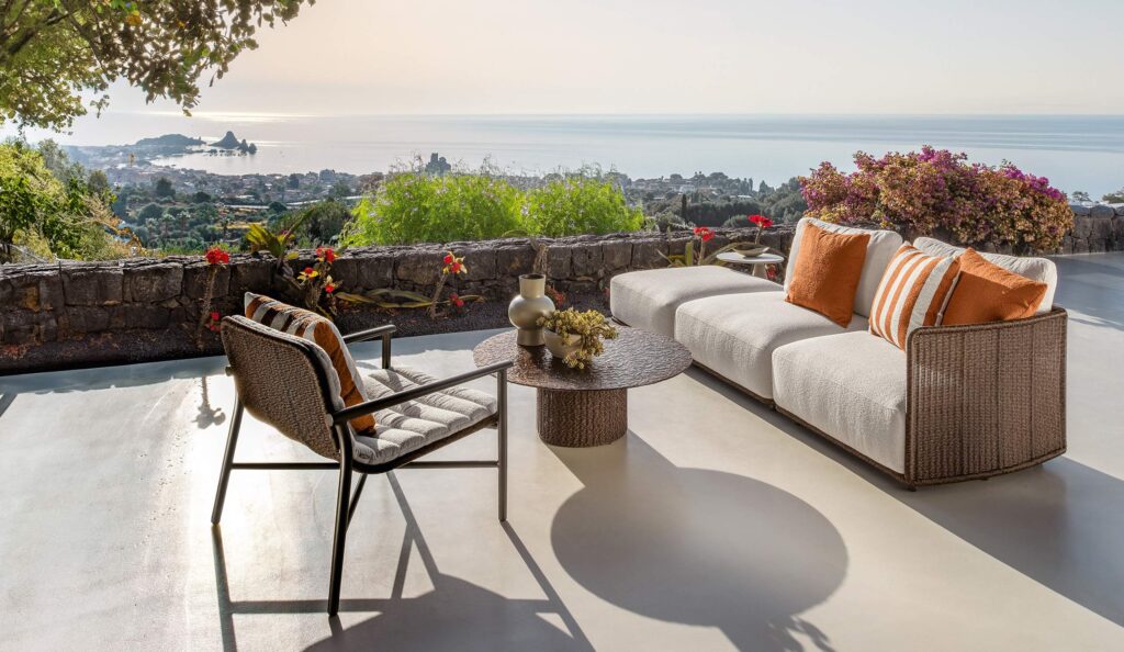 The large Bond coffee table is a sculptural element that enriches the environment with elegance and personality. The textured glass top, with hues ranging from coffee to smoky grey, reflects a deep bond with the earth’s profiles, evoking materiality and chromatic nuances. Supported by cylindrical wicker bases, the table combines innovation and craftsmanship, integrating seamlessly into the collection. Its discreet yet decisive presence becomes a meeting point, completing the outdoor living area with a refined balance of lightness and solidity.