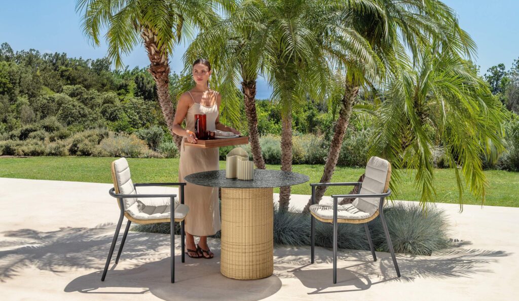 The Bond dining armchair combines visual lightness with functional comfort. The refined aluminum structure embraces a wicker weave that adds warmth and texture. The ergonomic backrest and the bouclé fabric upholstered seat provide long-lasting comfort, perfect for outdoor convivial moments. With its linear yet sophisticated design, it harmoniously complements the dining tables of the collection, creating a coherent and elegant ensemble.
