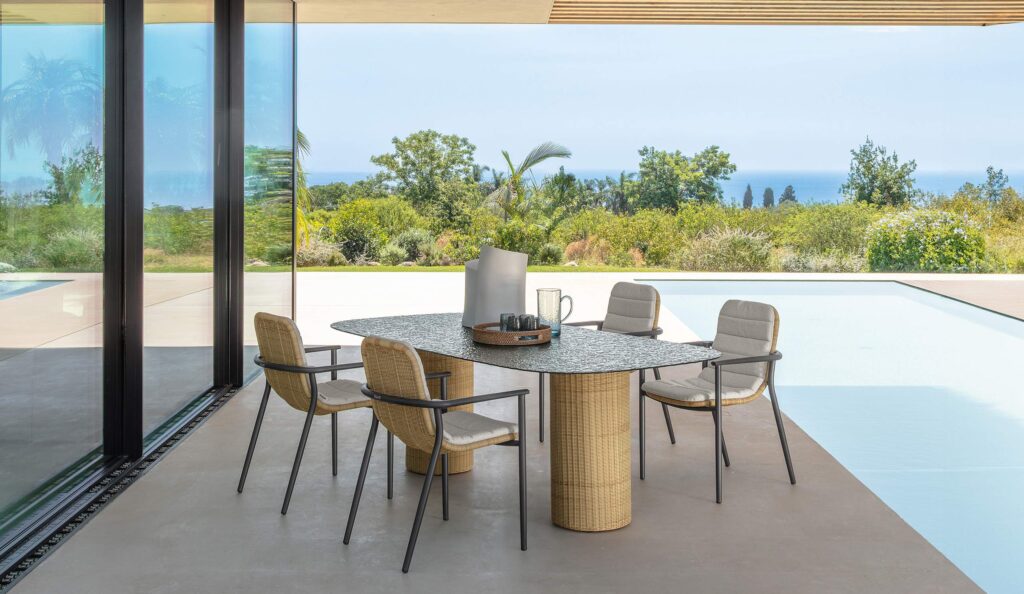The Bond dining table is a style statement that celebrates outdoor conviviality. Cylindrical bases in wicker, with pure and essential lines, support a wide textured glass top, whose shades range from coffee to smoky grey. The refined material effect of the surface merges with the visual lightness of the structure, creating a balance between solidity and transparency. Designed to host moments of sharing, it becomes the focal point of the dining area, blending innovation and tradition in an elegant presence.