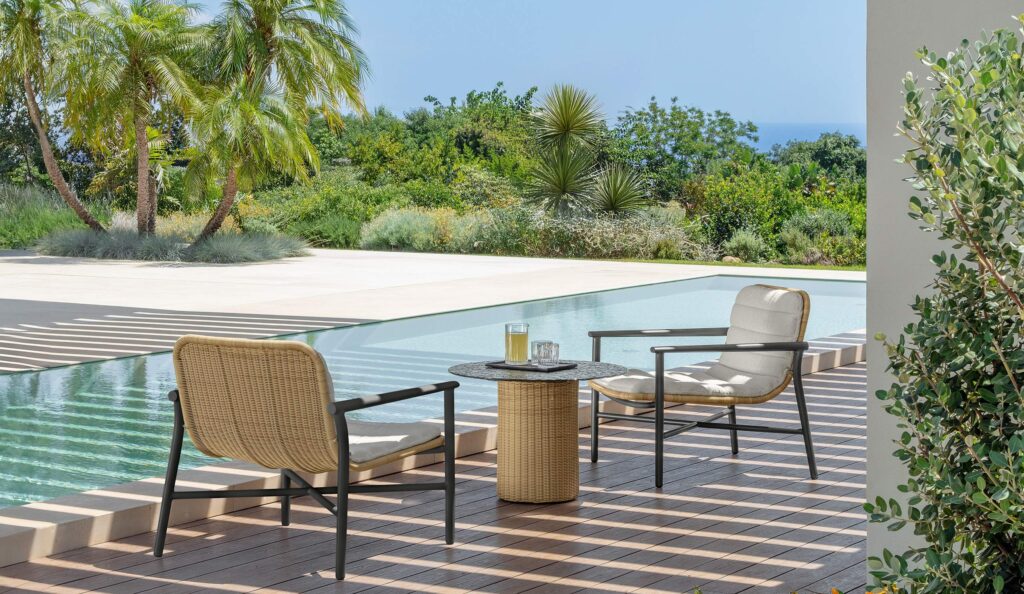The Bond lounge armchair reinterprets the pleasure of leisure with a design that blends comfort and style. Balanced proportions, a wide seat, and deco cushions immediately convey a sense of welcome. The aluminum frame, covered in woven wicker, lightens the visual impact and ensures long-lasting durability, while the soft, enveloping forms create a harmonious interplay of volumes and shadows. Perfect for moments of relaxation, it adds character and aesthetic continuity to any outdoor space.