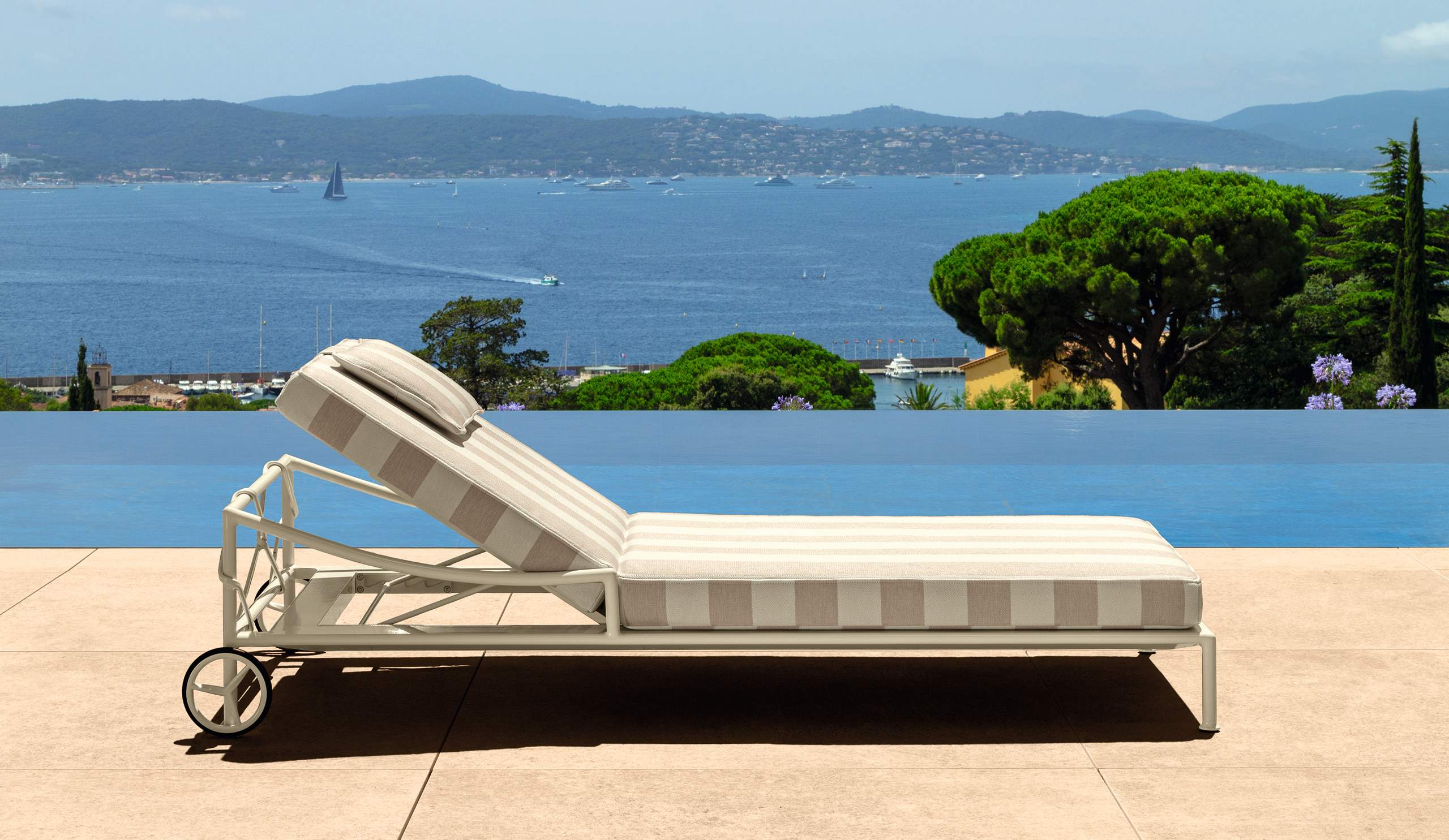 The Capri sunbed translates the elegance of the collection into an essential and refined form, designed to experience outdoor relaxation with lightness and style. The aluminium frame, defined by a slender and sophisticated design, delicately recalls the craftsmanship of wrought iron reinterpreted in a contemporary key. The soft lines and adjustable backrest offer comfort and visual harmony, while the rear wheels make the sunbed easy to move.