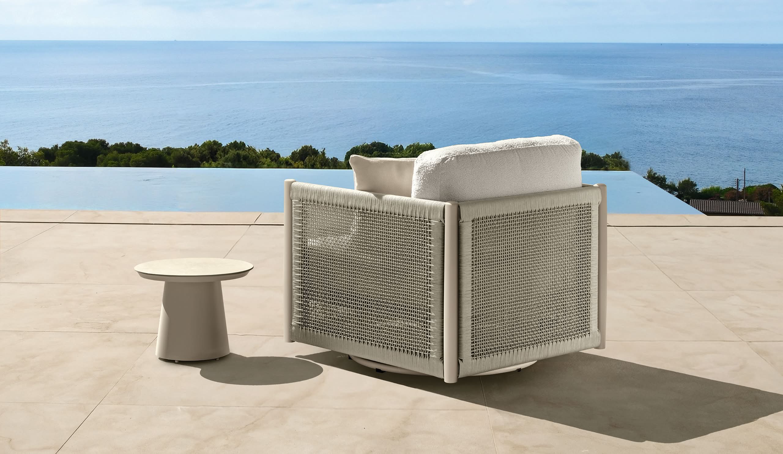 The aluminium living armchair combines elegance, comfort, and functionality in a single, harmonious form. Its solid structure, lightened by the side rope weave and available in two finish options, stands out for its perfect balance between design and durability. The swivel base adds a touch of dynamism, allowing natural freedom of movement and effortless comfort. The cushions in natural tones complete the composition, making this armchair a refined and versatile element, ideal for enhancing any outdoor setting with style.