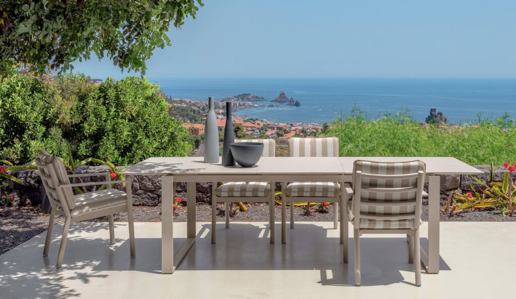 The Finn dining table completes the collection with a strong and architectural presence: a sled-style aluminium base, weather-resistant and easy to maintain.