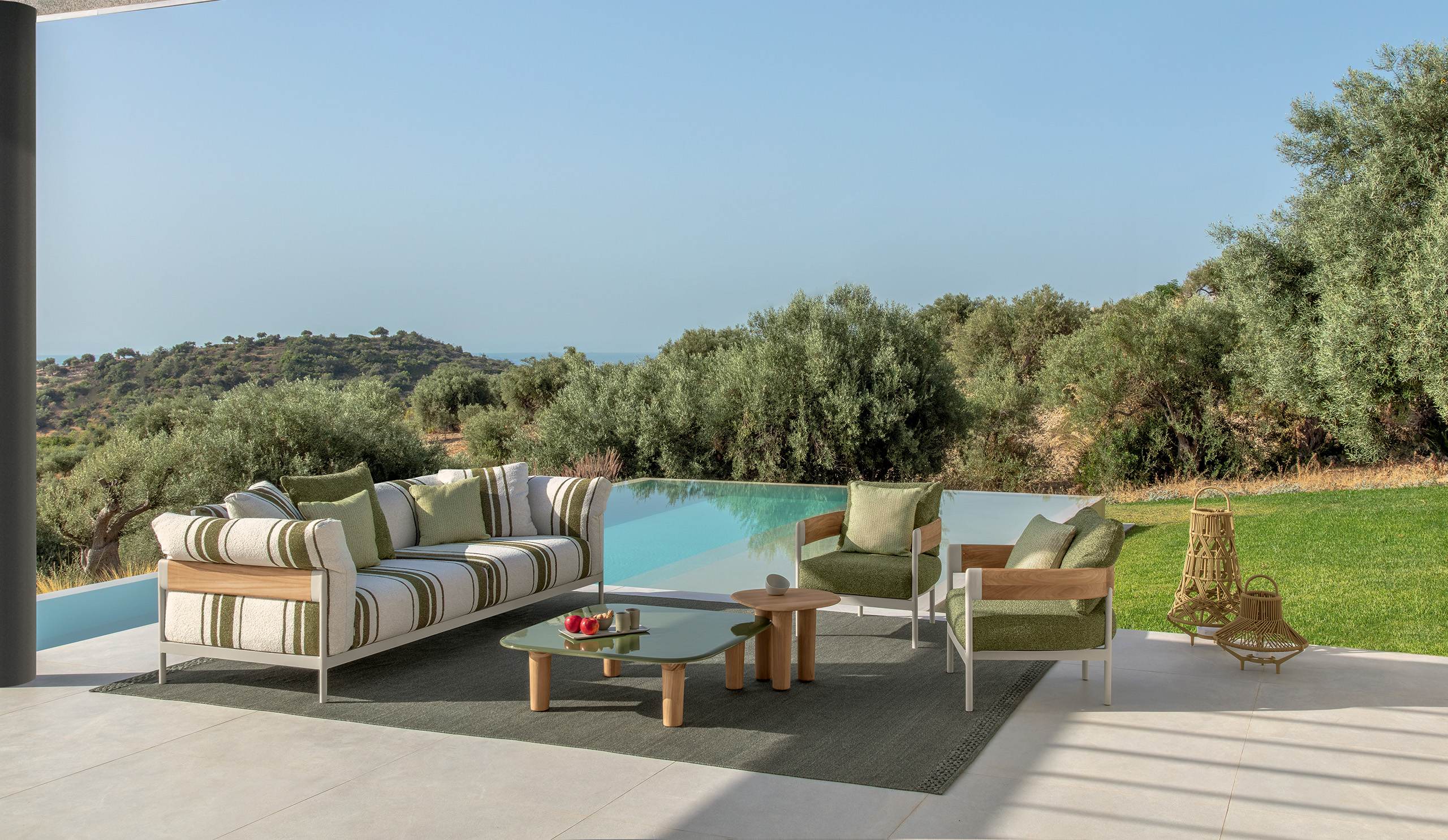 Welcoming and scenographic, the 3-seater sofa provides all the space needed to share moments of relaxation with others. Fluid, contemporary lines blend with the solidity of aluminium and the natural beauty of teak, creating a material balance of great aesthetic impact. Wide cushions, upholstered in refined fabrics, offer a sensation of enveloping comfort, while the frame’s tones add elegance and character to any outdoor setting.