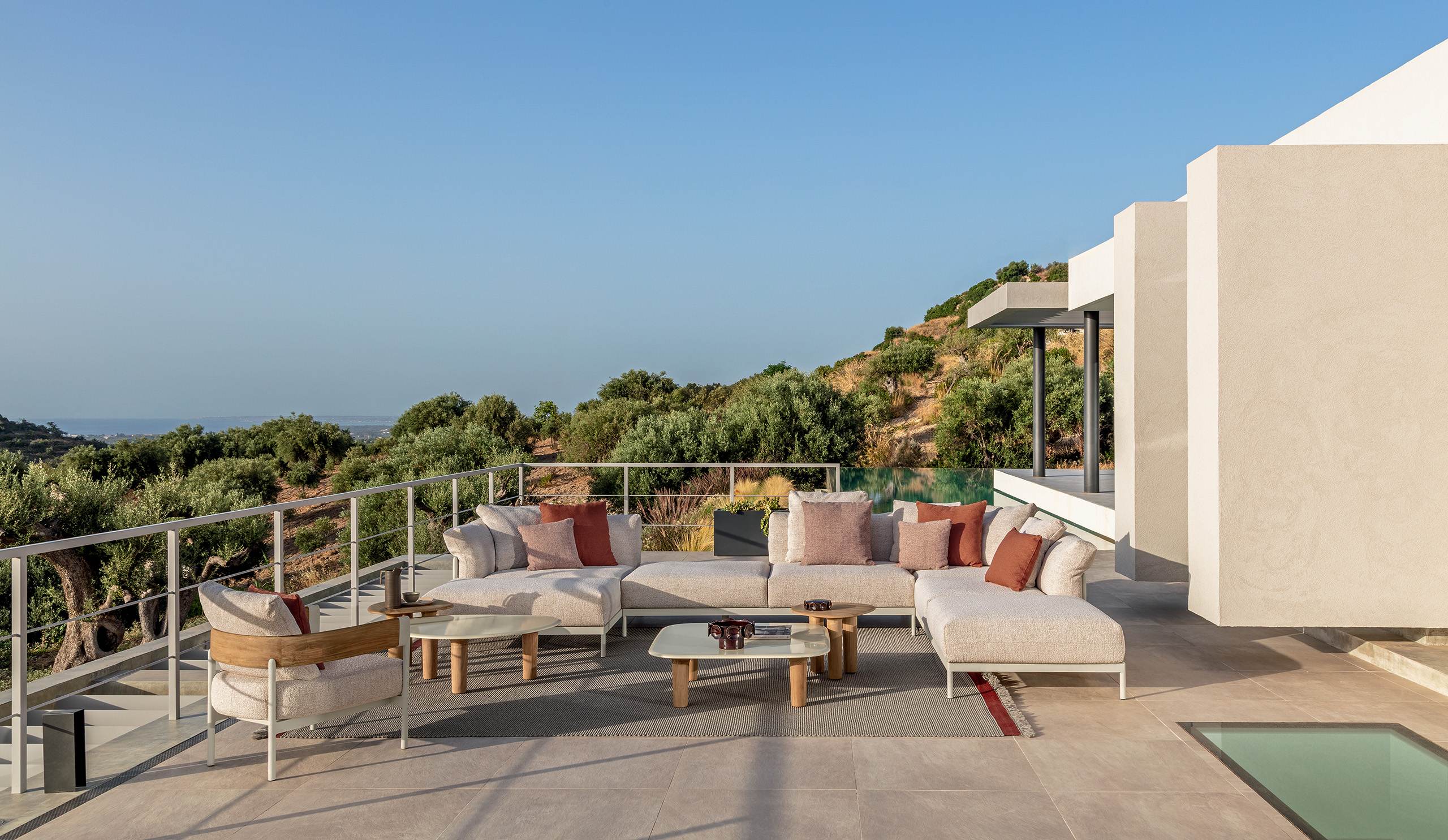 Compact and elegant, the 100×100 coffee table with rounded profiles is the ideal complement to outdoor conviviality. The teak structure, light yet resistant, merges with the refined glazed stoneware top, creating a furnishing solution that unites practicality and sophistication. Perfect next to lounge chairs or sofas, it becomes the natural support for a coffee, an aperitif or a book, transforming the outdoor into a welcoming and stylish lounge.