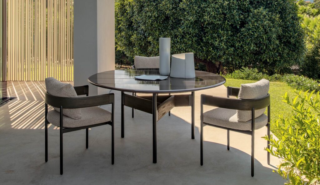 The D150 dining table embodies the spirit of conviviality and sharing typical of outdoor living. Its harmonious and balanced lines develop around a solid, elegant aluminium frame, enriched with teak details that underline its natural refinement. Designed for lunches, dinners and gatherings, it combines the warmth of wood with the aesthetic strength of glazed stoneware in milk white or olive green, bringing indoor elegance to outdoor settings.