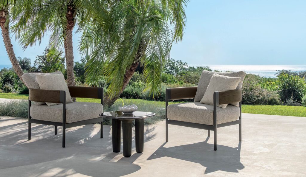 The lounge armchair is designed for those seeking total relaxation, in a space dedicated to contemplation and well-being. Its soft, generous shapes are enhanced by the meeting of lacquered aluminium and the warmth of teak, a mix that conveys balance and harmony. Selected fabrics, also available in decorative striped versions, enrich the seat, adding a sophisticated touch to the outdoor space and transforming every moment into pure comfort.