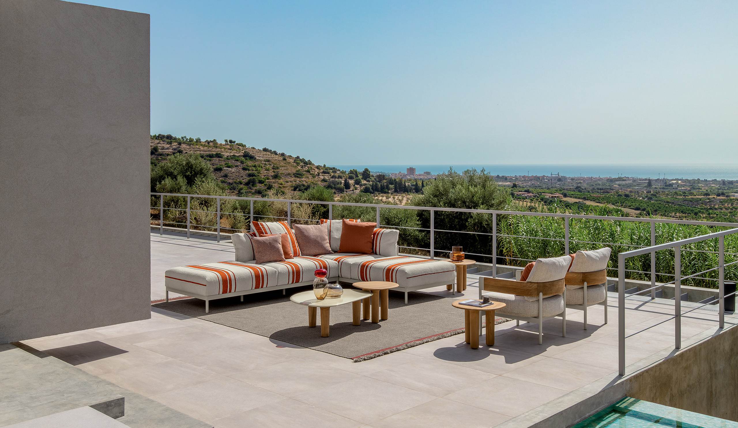The modular sofa represents the essence of the collection: a flexible, versatile system that allows endless compositions, adapting naturally to both large and intimate spaces. The aluminium frame, offered in refined warm white or moka finishes, harmoniously dialogues with teak and striped fabrics of strong decorative value. Generous, enveloping cushions enhance comfort, transforming the outdoor living area into a personalised oasis of well-being.