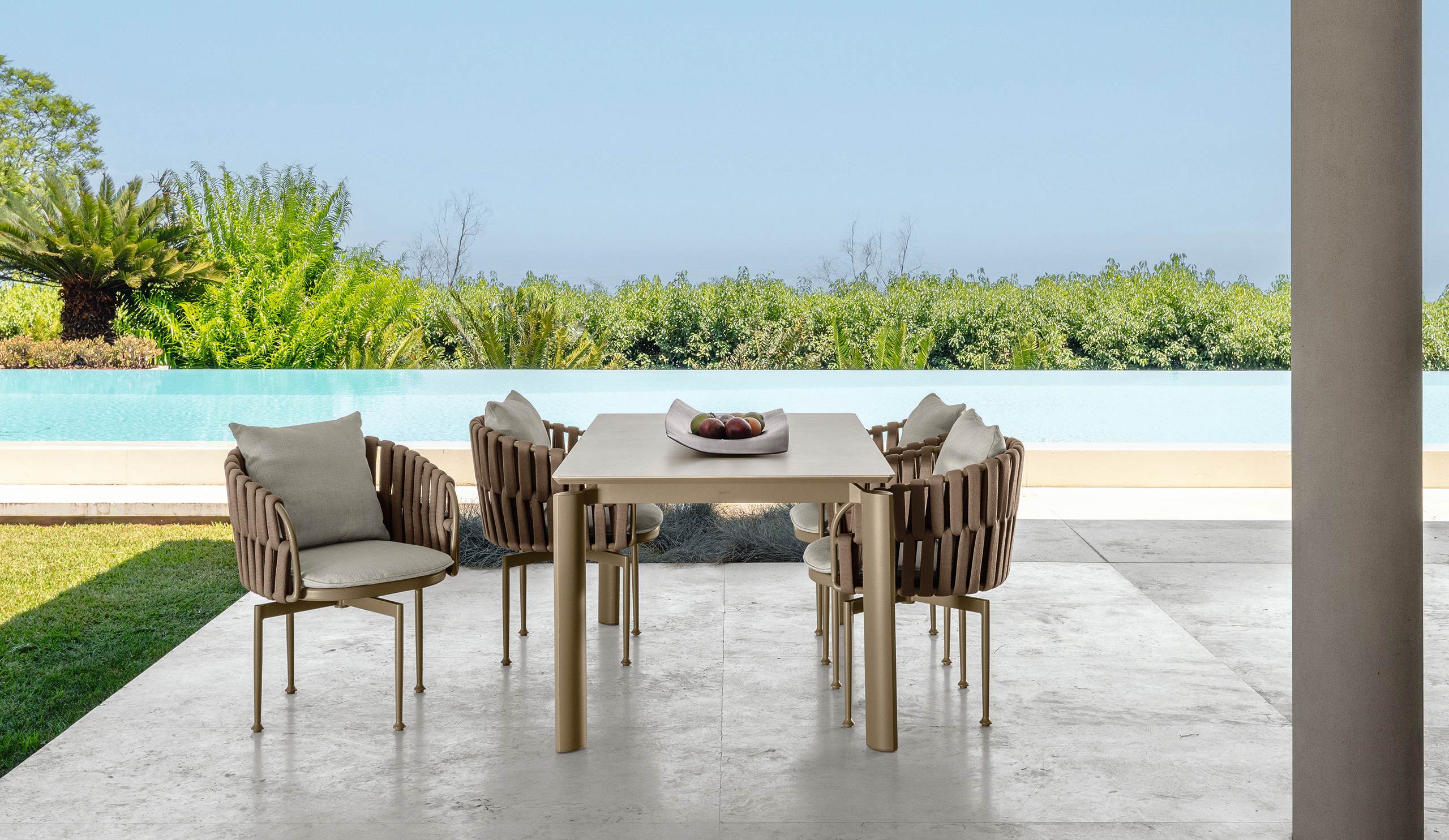 The Frame Dining Armchair embodies the essence of the collection, transforming lightness and comfort into a single, refined seat. The slender and harmonious aluminium frame dialogues with the soft volumes of the cushions and the padded rope weave that embraces the backrest. The swivel base adds a touch of dynamism, offering freedom of movement that enhances the pleasure of conviviality. Sensual and elegant, it is the perfect element to enhance any outdoor living space with style.