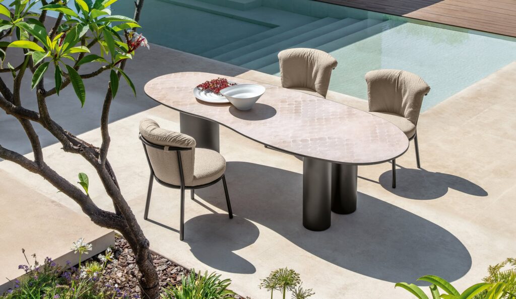 The aluminum structure dialogues with the material surface of the top, defining a refined and timeless aesthetic.