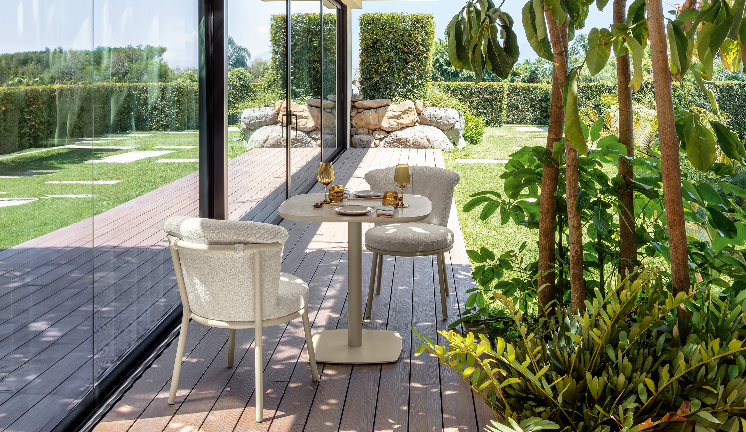 The powder-coated aluminum structure pairs with the tactile surface of the top, creating a refined, contemporary ensemble suitable for any outdoor or indoor space.