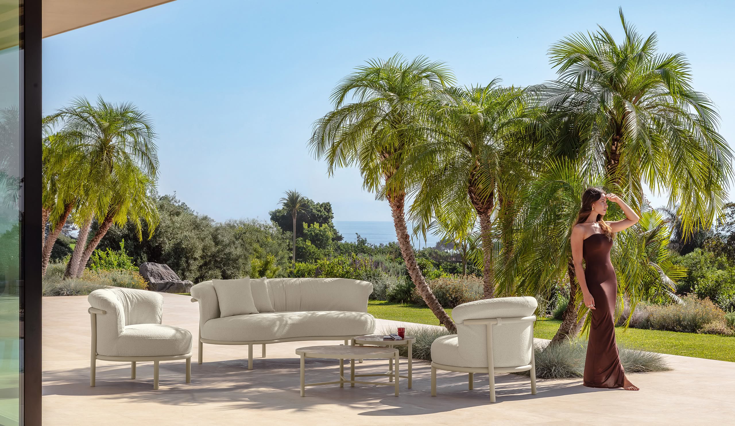 The James sofa elegantly expresses the concept of structured softness. Its curved and fluid lines meet in a harmonious silhouette that invites relaxation and conversation. The powder-coated aluminum frame, strong yet lightweight, supports an enveloping cushioning system with balanced proportions — a perfect harmony between comfort and design.
