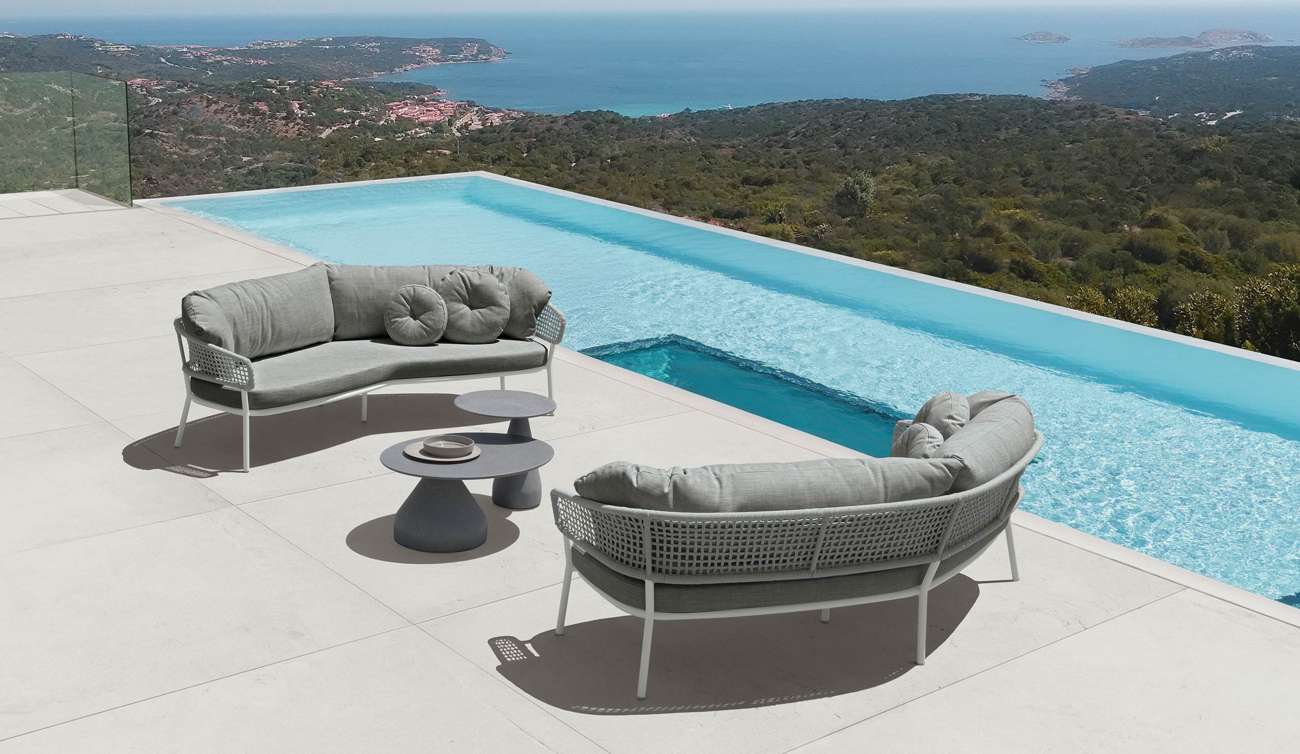 The structure is in aluminium covered with a braiding of ropes in a synthetic fabric. Cushions with a removable fabric, easy to wash and resistant to weather resistant. Quick dry foam padding.