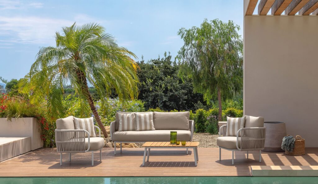 The powder-coated aluminum frame and synthetic rope weave interact with the softness of the cushions, creating a balanced and welcoming silhouette.
